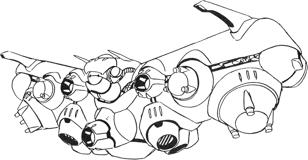 The Damoth is Commander Dohn’s ship and is accompanied by two Raabas. It is one of the smaller Paranoid ships at 80 meters in length and 200 meters in width. The Damoth is armed with large cannons and long range missiles and carries a number of Battle Drones. When all else fails, the Damoth’s shell falls away to reveal the fearsome Dinosaut.