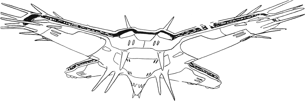 The Rongu is the flagship of the Paranoid fleet that we see fighting with the Solnoid at the beginning of the movie. It is 1,800 meters long and about 1,200 meters wide. In the third image below we see the Rongu separating its outer covering to reveal its long range missile bays for an attack.