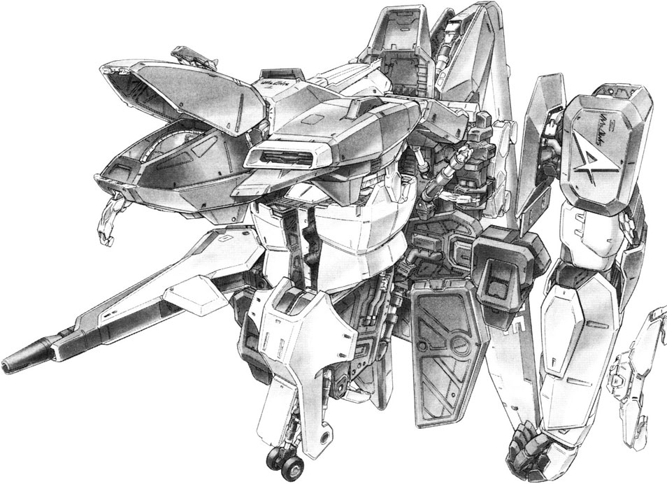 Instead of the flying armor used by the original Zeta Gundam, the Zeta Plus is equipped with variable geometry wing binders similar to those of the MSN-00100 Hyaku Shiki. These wing binders improve the flight characteristics of the wave rider form, giving it a cruising range of hundreds of kilometers, and in mobile suit form they can be used for AMBAC maneuvering rather than simply becoming dead weight. The Zeta Plus is also equipped with two thigh beam cannons, which are connected directly to its movable frame so that energy supply and fire control can be performed without using the mobile suit’s hands.
