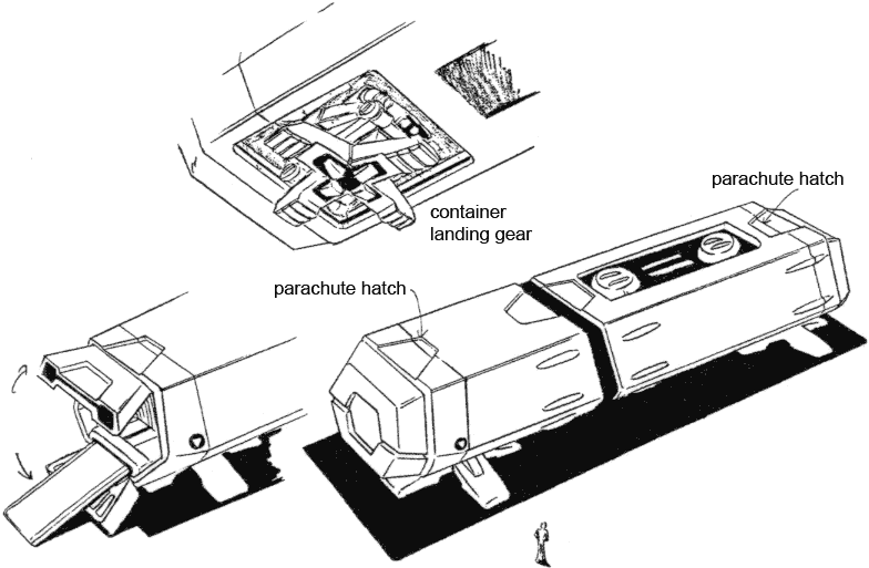 The Horizont is the smallest of the ships used by the Second and Third Invasion Fleets. It is designed to enter Earth’s atmosphere and deliver two assault pods. Each assault pod is designed as a command post that, once firmly on the ground, opens its hatch and releases troops to join the assault on Reflex Point. Each Horizont carries a Legioss attached to a Tread on its underside that is released to fight in orbit and escort the Horizont as it lands on Earth. The Horizonts that took part in the Third Invasion Fleet were painted red and dark gray.