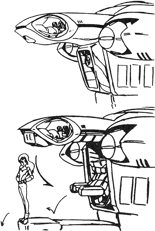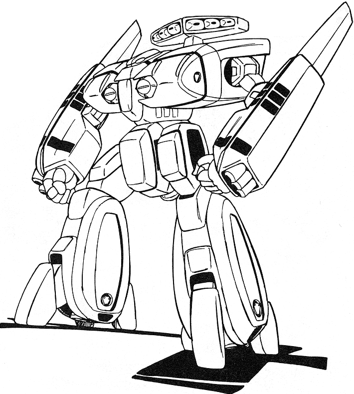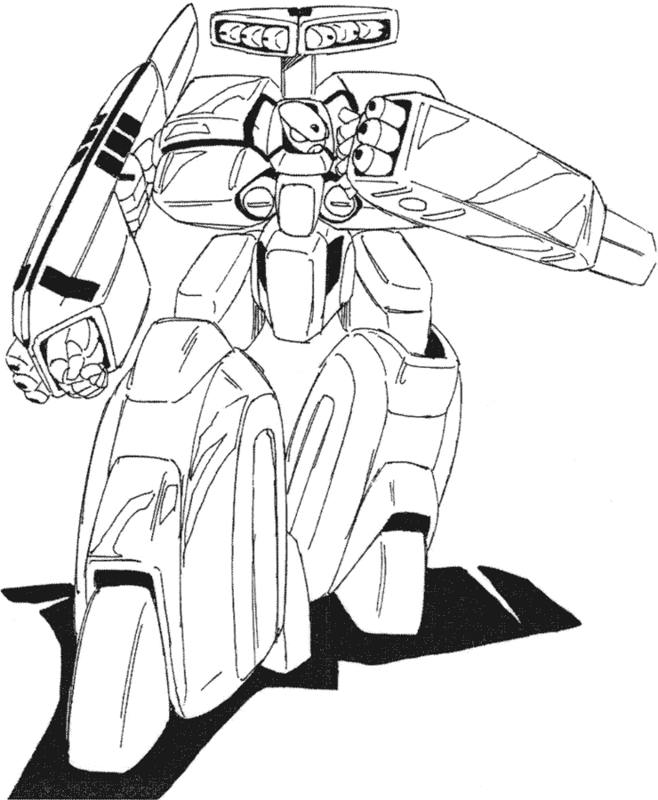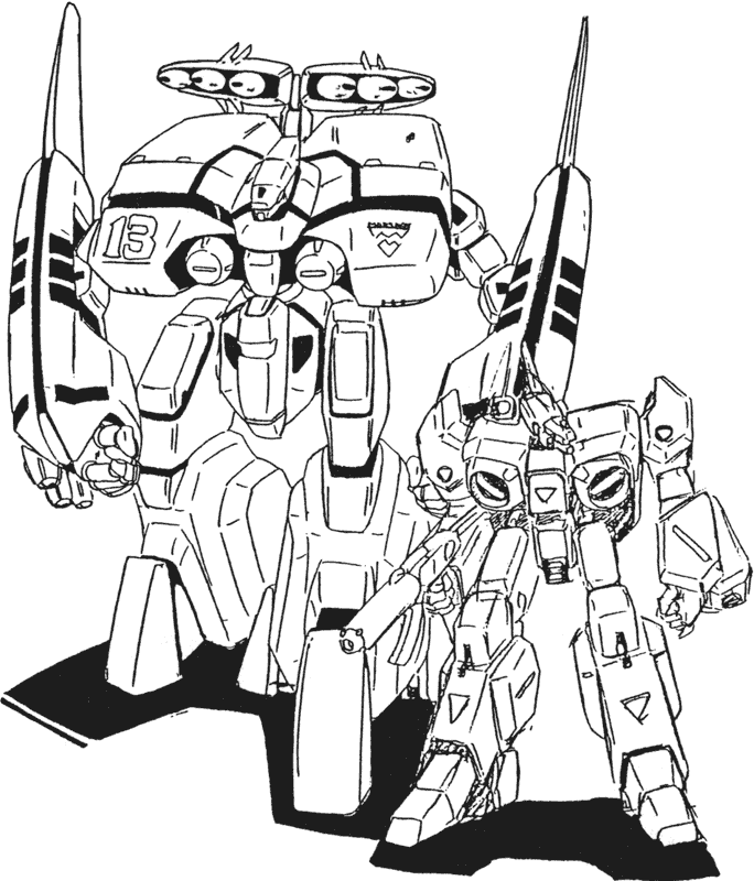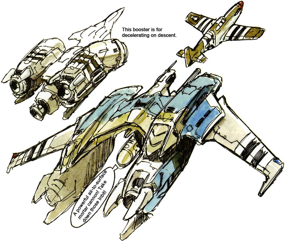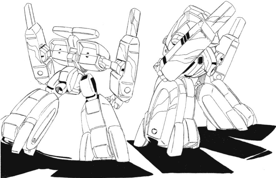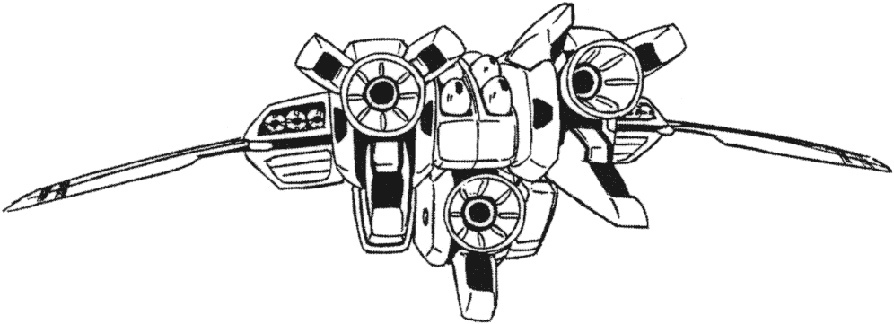 While the Legioss was still in the planning stages development began for its support craft, the Tread. The Tread is one of the new weapons developed for the Second Invasion Fleet. Planning notes for Genesis Climber Mospeada list the Tread’s original name as TLEAD: Transport Legioss Escort Armored Dreadnought. The Tread is a reinforced booster for the purpose of increasing the Legioss’ cruising distance and combat efficiency both inside and outside the influence of gravity. The Tread can transform from an armo-bomber into a heavy armo-soldier and can play a role as a backup for the Legioss in space or as a supporting weapon that can act independently from the Legioss on the ground. In addition to the above, bombing is an important function. It can fit many different types of munitions inside, such as napalm bombs. The Tread we see most in Genesis Climber Mospeada is painted blue and white but other Treads are green and white. There are probably red Treads used by Jupiter Base. Unlike the Legioss, the Tread has space inside for two or three passengers. Aisha and Mint sometimes have to take refuge in the Tread.