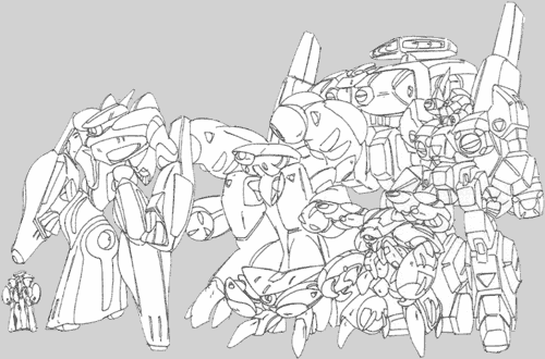Genesis Climber Mospeada’s Inbit mecha were primarily designed by Kakinuma Hideki. Except for the Ghoss, the mecha listed here are not vehicles that are operated - they are permanent mechanical bodies. Instead of entering cockpits, Inbit soldiers are fused with the mechanism and it becomes their body. The resemblance to crabs is deliberate. The Inbit soldiers residing within those mechanical bodies are lower links in the chain of Inbit evolution. All Inbit that operate outside of Inbit hives have the ability to see the energy signature given off by machines using HBT fuel cells. This makes it much easier for them to locate humans and monitor their activity. The names of many of the mecha are open to interpretation when putting into English letters. Variant spellings are listed in the profiles.