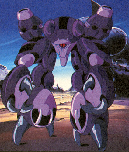 The Grob was a mechanical body design in use when the Inbit first invaded Earth. Grobs can fly but are designed more for ground combat and are often seen walking. They cannot operate in space. All Grobs are the same two shades of purple. Grobs occupy the lowest rank in the Inbit forces and are never seen in a position of authority. Before Garmos and human-form Inbit are created, Grobs are mentally linked to Refless. She sees through their eyes and commands them directly.
