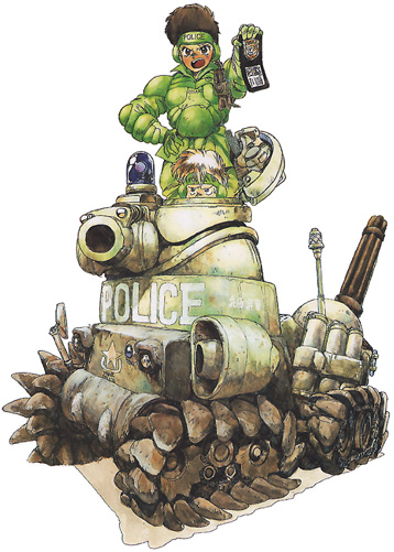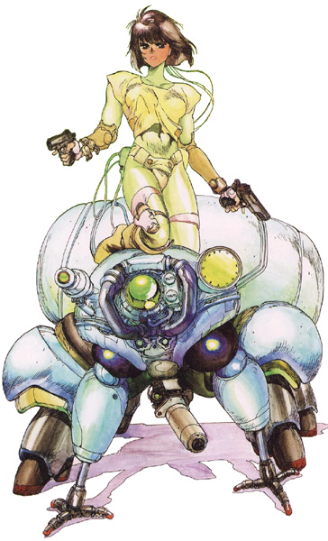 Shiro’s mechanical designs are inimitable. His intuitive knowledge of mechanics and scientific principles coupled with his natural talents in art and illustration have resulted in a wealth of science-fiction designs and stories that the world is only now beginning to discover. Shiro has said in essays that he dislikes the giant robots that have become a staple of science-fiction in Japan due to their implausibility. However, he has nothing against smaller ones! Shiro designs display complex curves and very detailed mechanics.