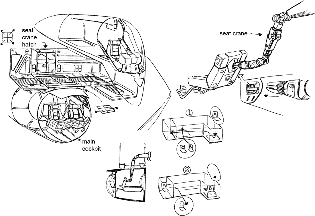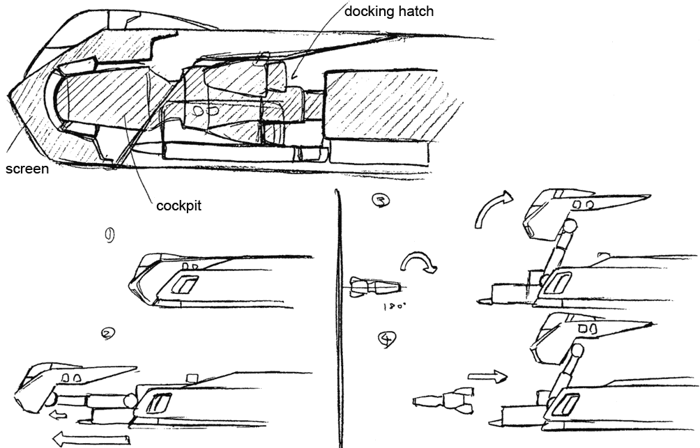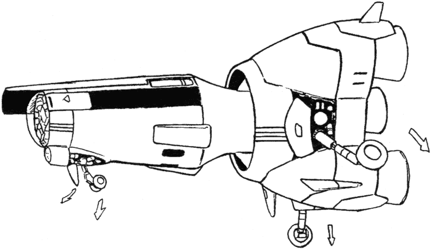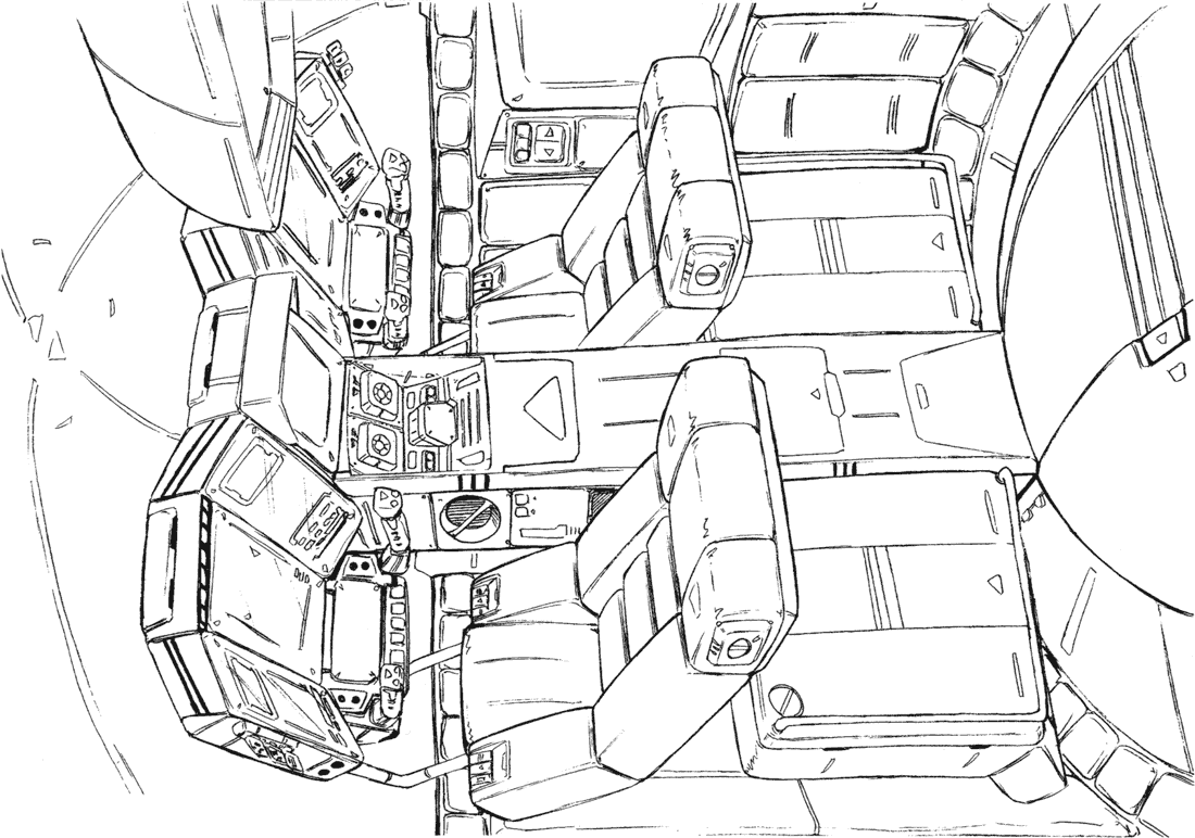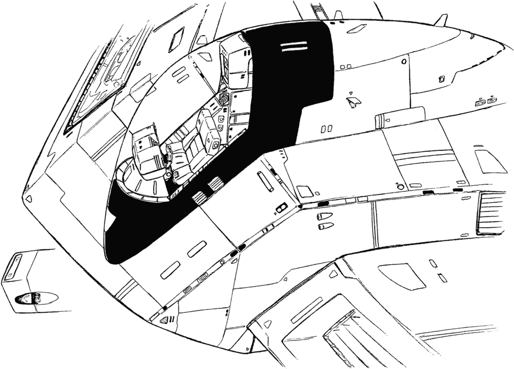 One of the truly interesting features of the first Lovely Angel is the separate craft it contains. The front of the Lovely Angel hinges up to allow a small spaceship called the Cockpit Capsule to emerge. The Cockpit Capsule has a beam cannon and can serve as an escape pod or boarding craft. The Dirty Pair have surprised adversaries who weren’t expecting such a small ship to have a hidden boarding craft. The Lovely Angel’s main cockpit is inside the Cockpit Capsule but a crane arm can remove one of the pilot seats and move it up to the secondary cockpit before separation.