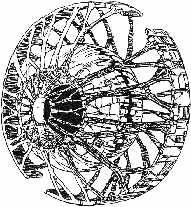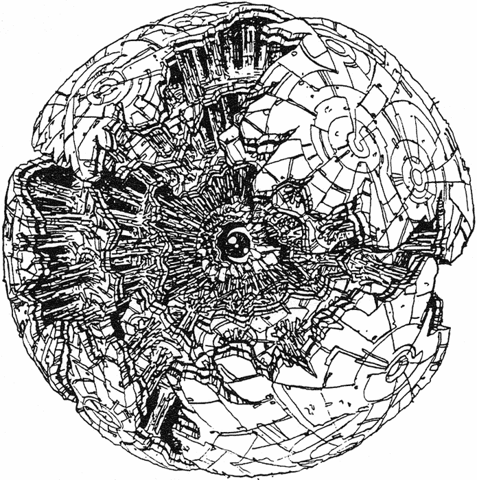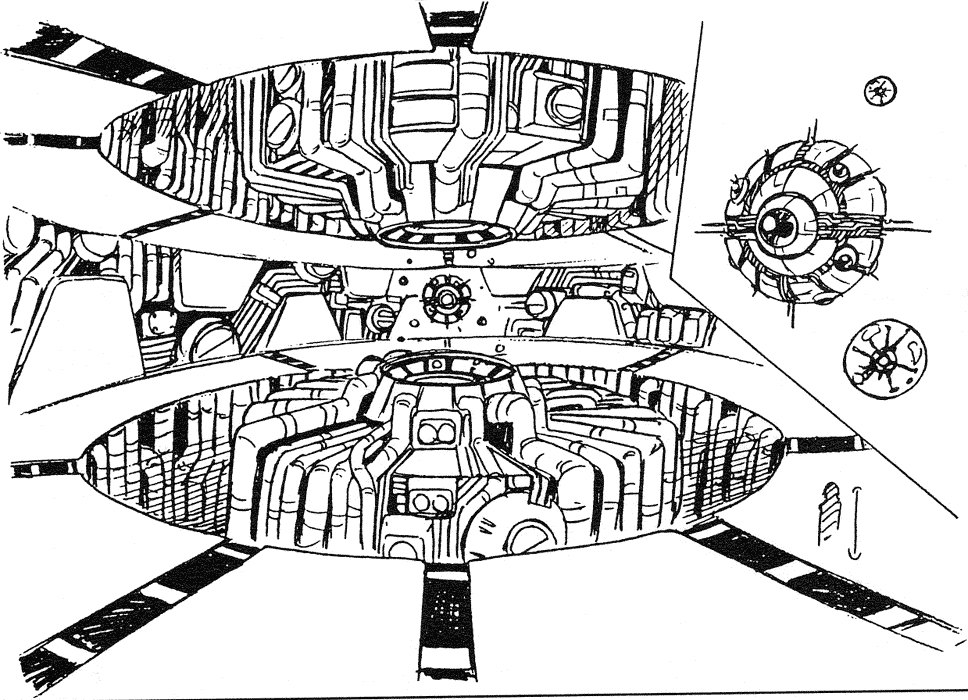 Damia is a system destroyer – a cannon capable of destroying a star with one shot. The resulting explosion destroys orbiting planets. Damia is so large that the Solnoid forces were able to disguise it as a planet. Before firing Damia must throw off its rocky disguise and display its true form. The third image below shows Damia’s computer core. The planet-sized cannon operates and fires automatically based on a pre-set timer so no crew are found aboard when Shildy and her teammates infiltrate in order to stop its firing.