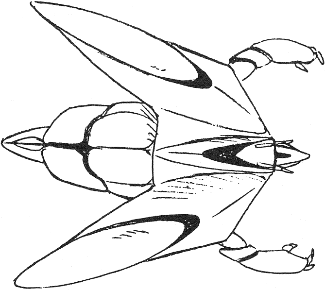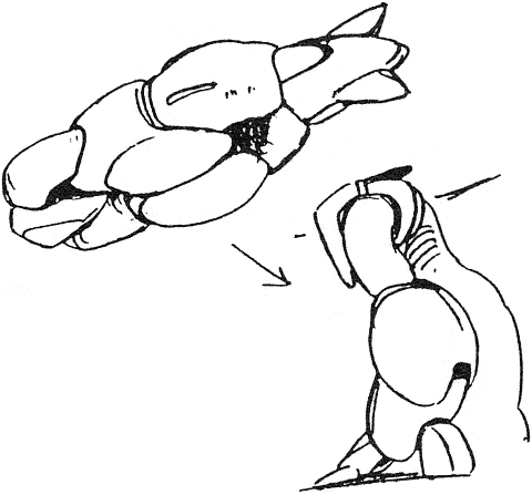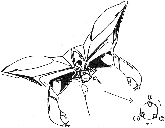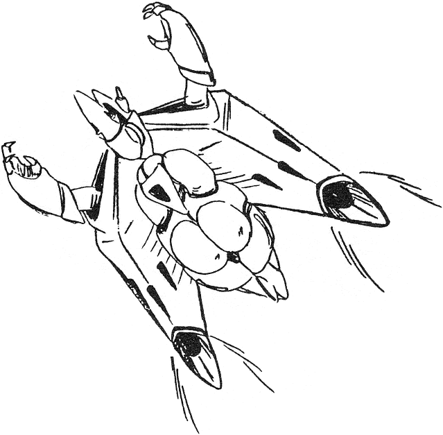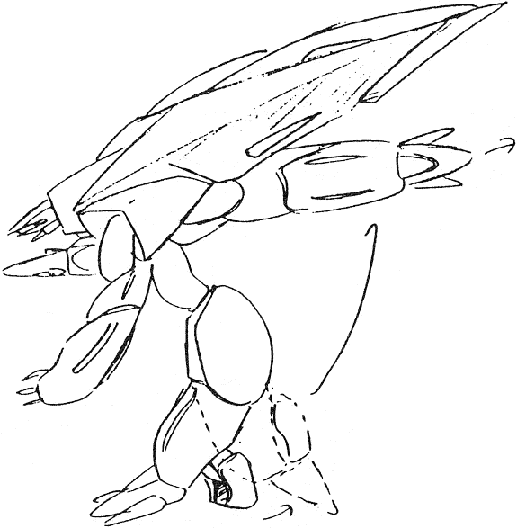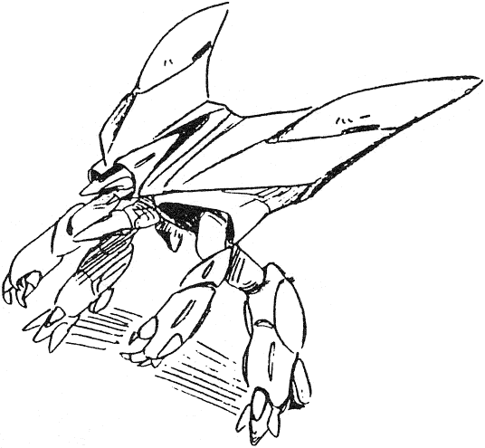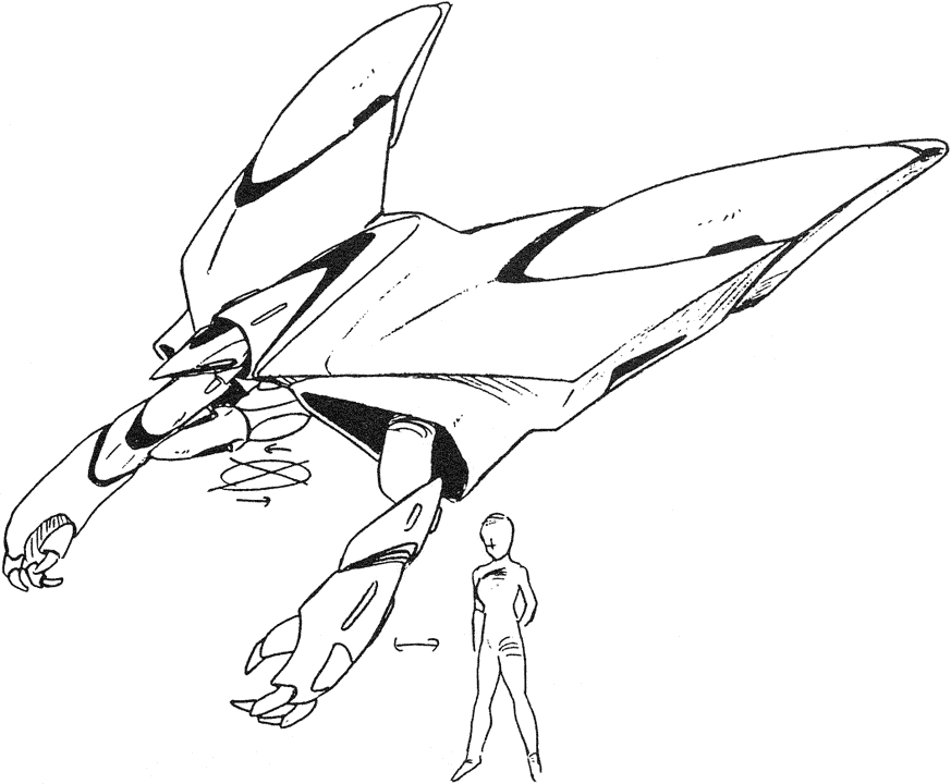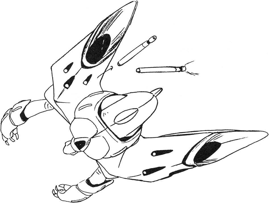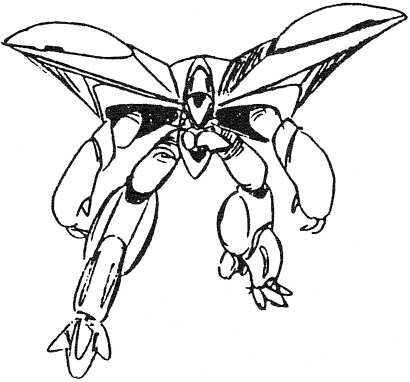 The Battle Drone is the standard fighter craft used by the Paranoid fleets in space and other settings. "Drone" is actually a poor choice of words as each Battle Drone is not a drone but a cyborg body inhabited by a Paranoid soldier. Just before being deployed a Paranoid soldier will enter a special cell that strips its organic matter away from its mechanical humanoid skeleton and injects it into a Battle Drone. Battle Drones fold their legs up behind them during flight and pull them down for walking when needed. This drone is an updated version of the one seen in Eternal Story. Unlike earlier models, this drone is equipped with guided missiles.
