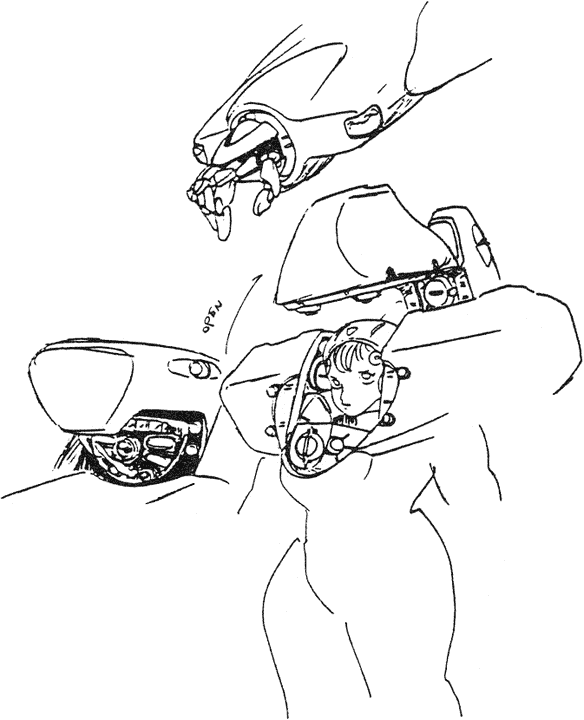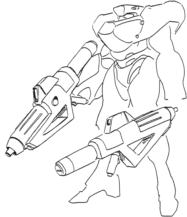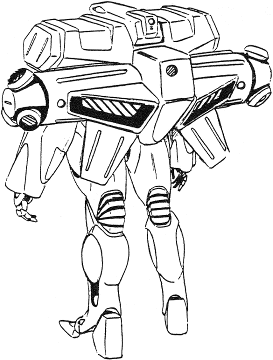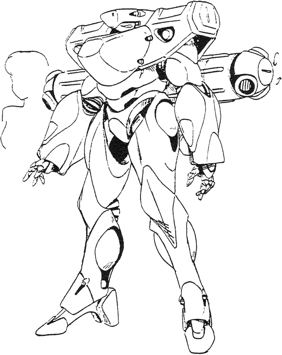 Struggle Suits are powered armor suits with thrusters for flight in space. They are used in a variety of defensive roles. Due to their small size and limited range they are not used as frontline fighters in battle. Stuggle Suits are used to defend battleships from Paranoid intruders. Special rooms are scattered throughout Solnoid ships where defending troops can put on the suits. This model seems to be an update of the one seen in Eternal Story.