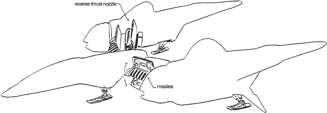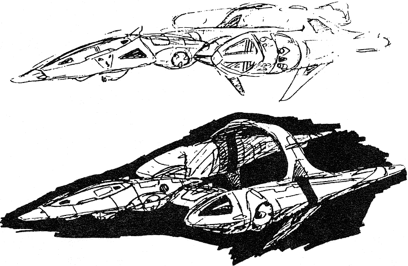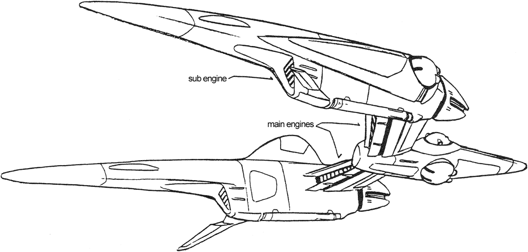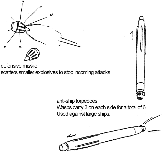 The Wasp is a sophisticated multi-role fighter. Three laser turrets and offensive missiles make it excellent for hunting down Paranoid battle drones. Six large anti-ship torpedoes make it a threat to large battleships as well. Retractable reverse thrusters make it highly maneuverable and rear-facing defensive missle bays make it difficult to shoot down. Wasps are piloted by Solnoid pilots, never cyborgs.