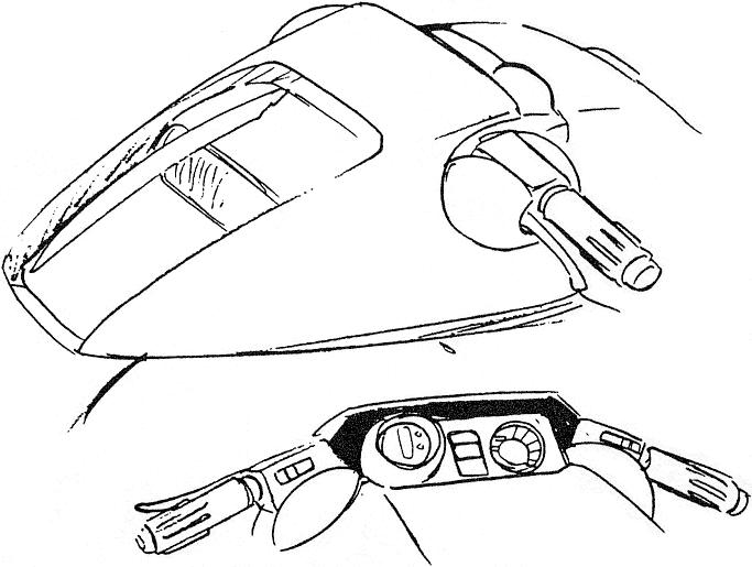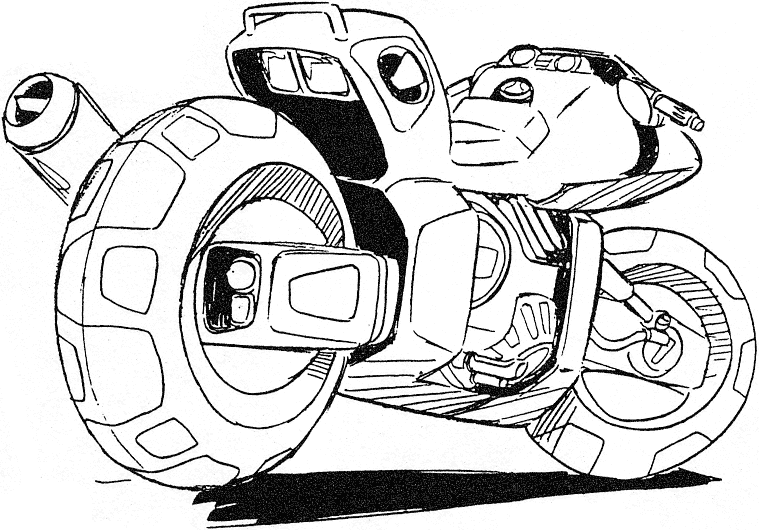 Although this motorcycle showed up in art books, it was sadly left out of Eternal Story. During the planning stages of the movie there was a design for a "bike locker" room where 2 racks stored a number of these motorcycles.