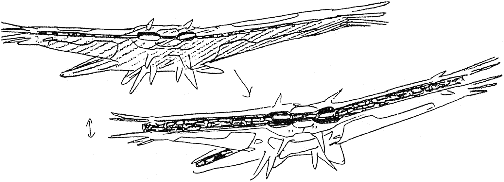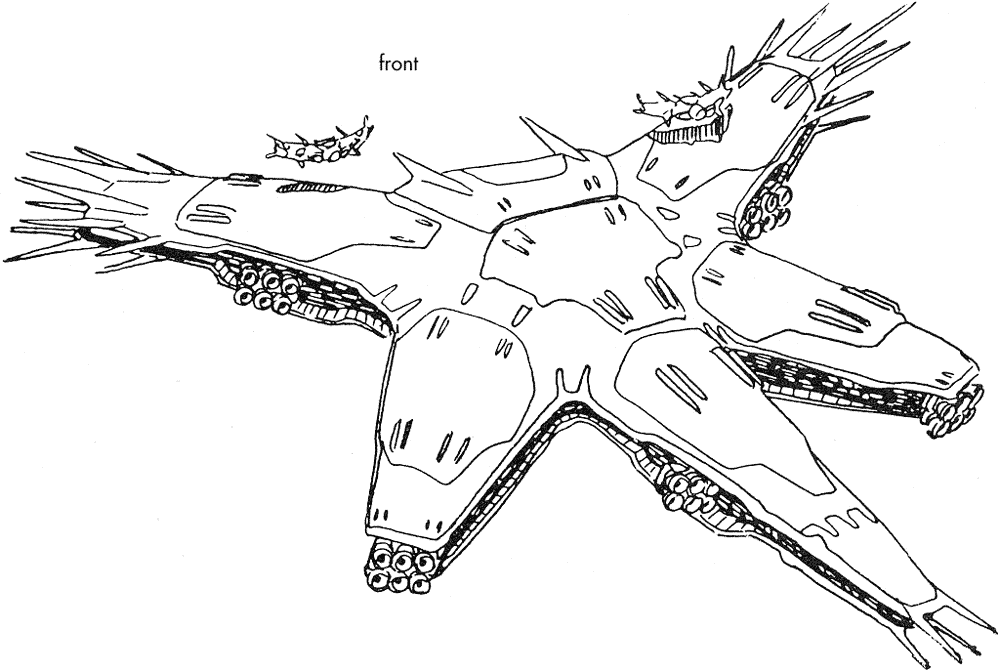 The Rongu is the flagship of the Paranoid fleet that we see fighting with the Solnoid at the beginning of the movie. It is 1,800 meters long and about 1,200 meters wide. In the third image below we see the Rongu separating its outer covering to reveal its long range missile bays for an attack.