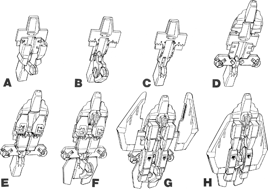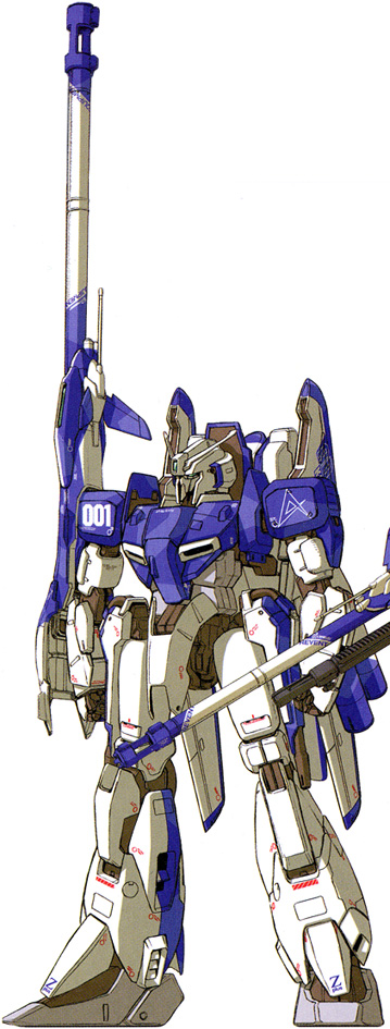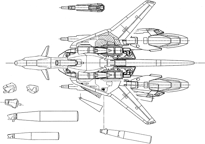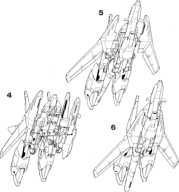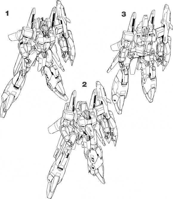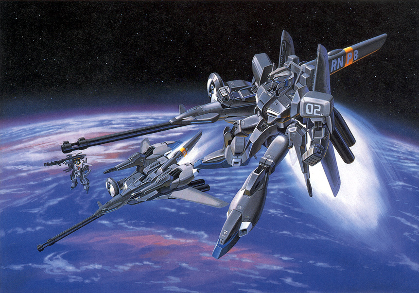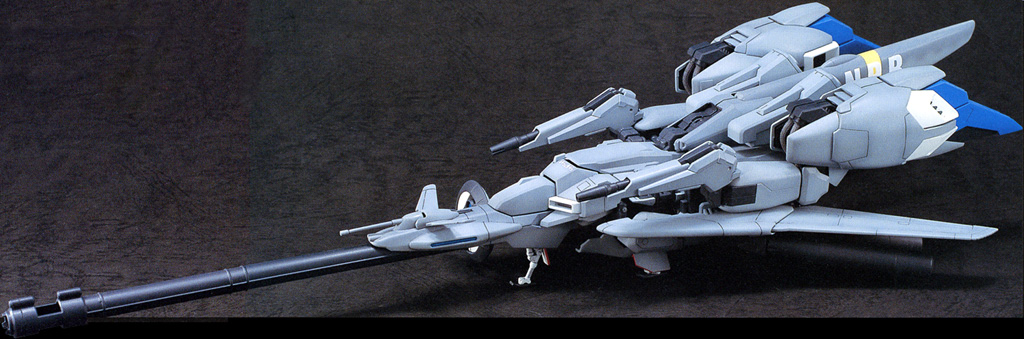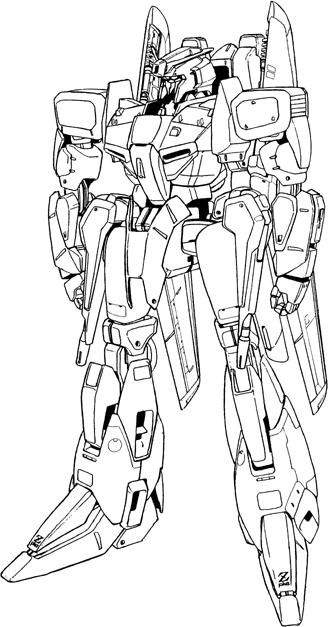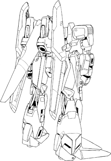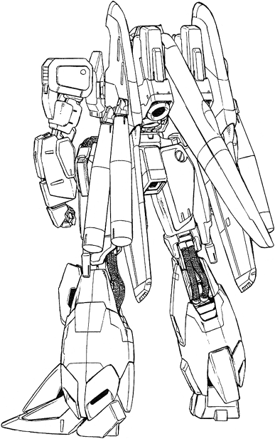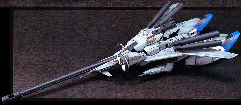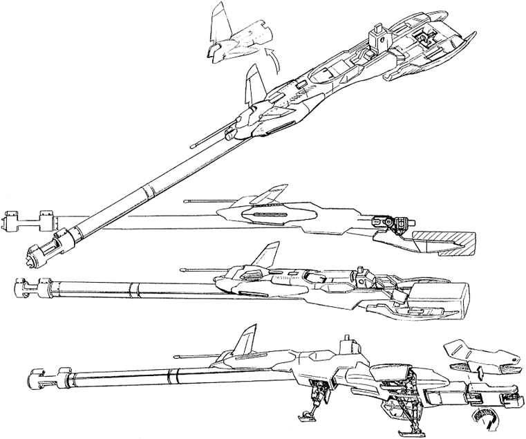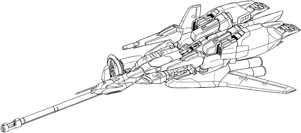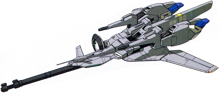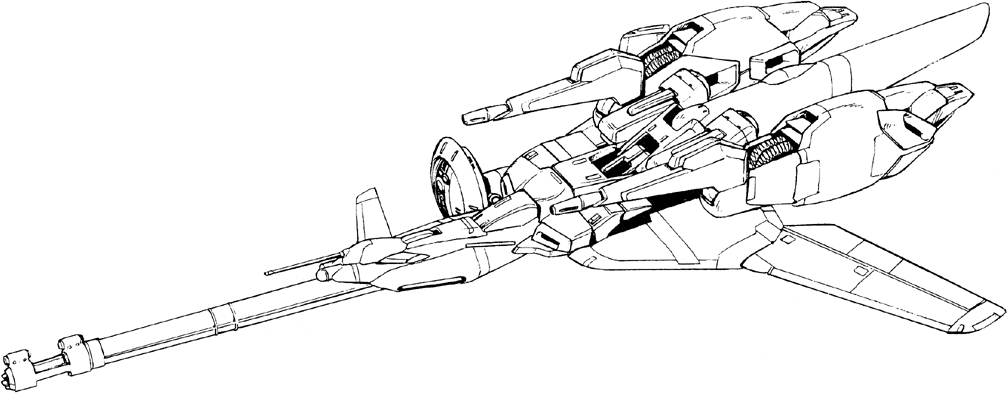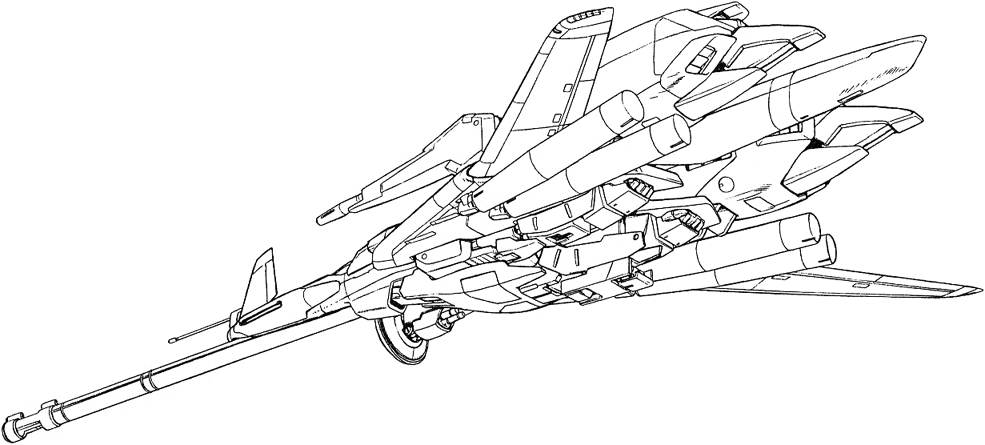The firepower of the C1 type can be increased by replacing its shield with a powerful beam smartgun. This beam smartgun is integrated into a flight sub unit that contains a small generator and energy CAP system, and it can be equipped with a coaxial disc radome for long-range attacks. In mobile suit form the beam smartgun is carried on the arm of the Zeta Plus, and in wave rider form it serves as the machine’s nose. Propellant tanks can also be attached to the wing binders, giving the Zeta Plus the ability to descend to the lunar surface and then launch back into space.