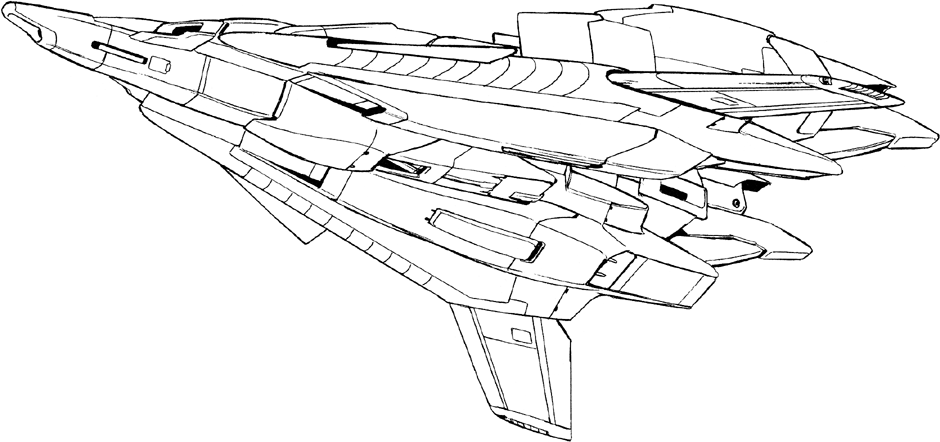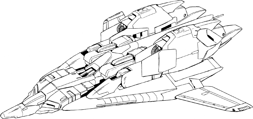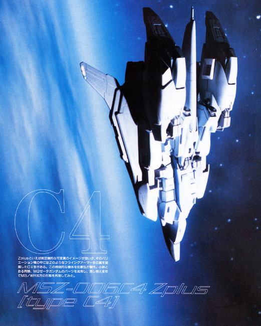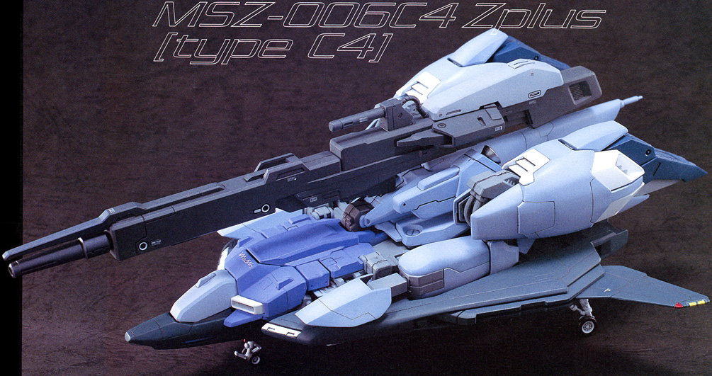 Unlike other machines of the Zeta Plus series, where the "wave rider" form is merely a nickname inherited from the prototype Zeta Gundam, the mobile armor form of the C4 type is a genuine wave rider which concentrates the shock waves of atmospheric entry on its underside to produce lift. The thigh beam cannons are eliminated for the sake of streamlining and replaced by a single beam cannon installed in its flight sub unit (or "shield"). Although its flight performance is inferior at ordinary altitudes, this type is ideal for hypersonic maneuvers at altitudes over 100 kilometers. Produced in small numbers, it is used for combat in low Earth orbit and to intercept enemy machines during atmospheric entry.