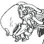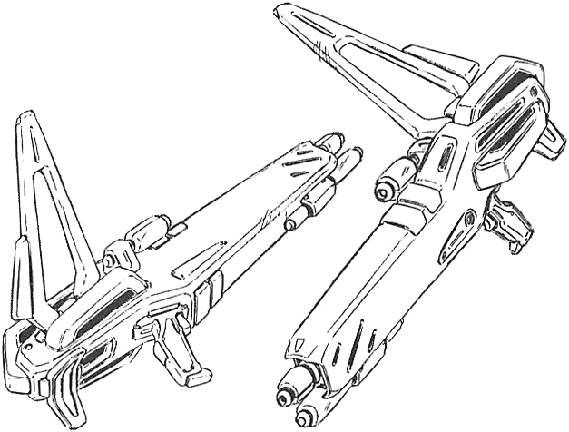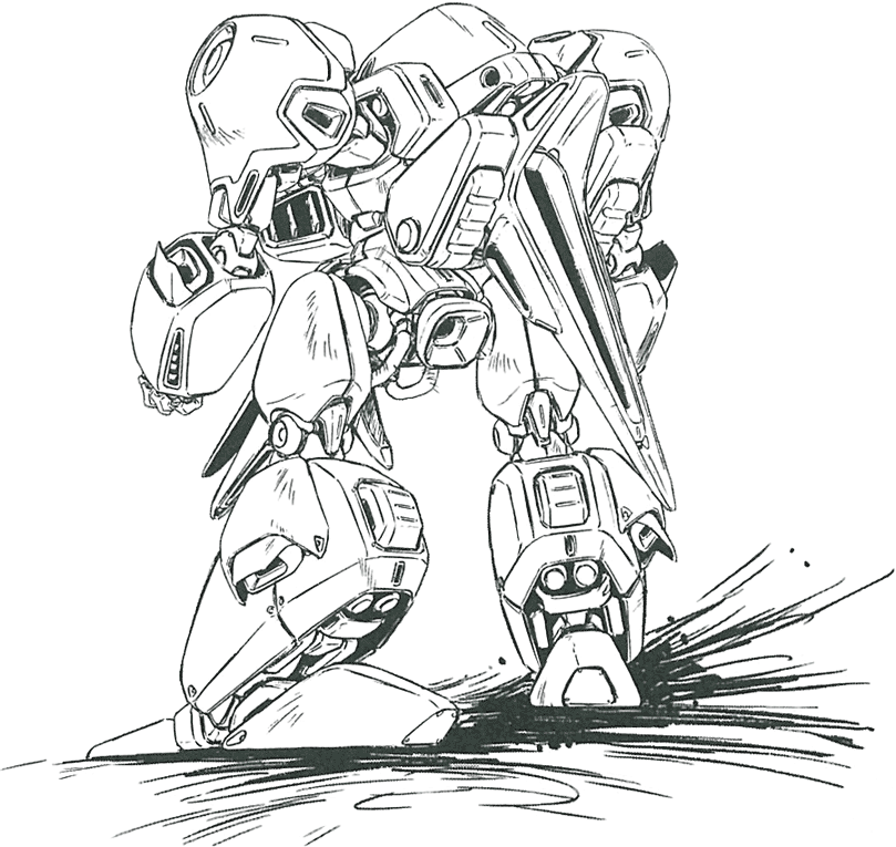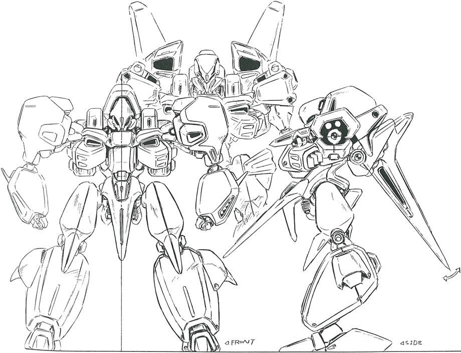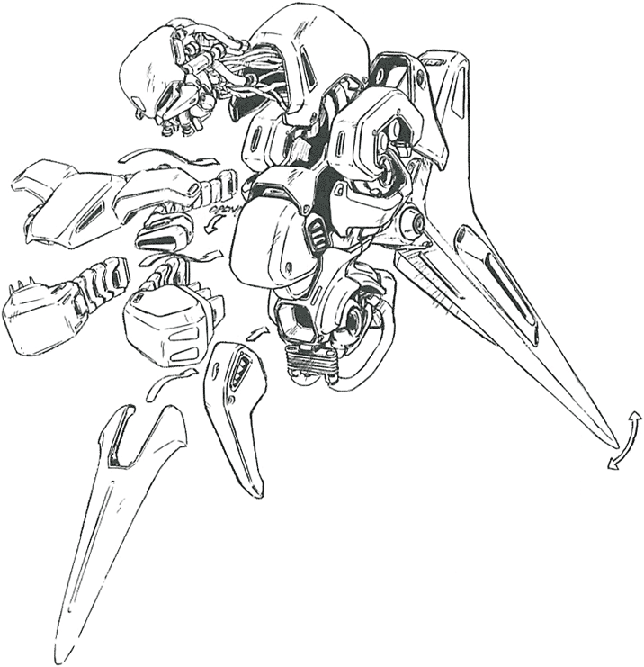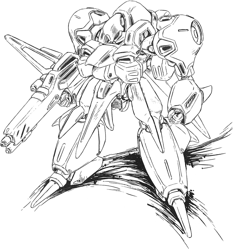 The Slave Sword is an unmanned mobile suit designed to be directly controlled by the pilot of the Tyrant Sword. The SE Generator of the Slave Sword is different from the one in the Tyrant Sword. Although more stable, it can only generate 40% of the power of the Tyrant Sword. Two Slave Swords were built before the SE Project ended.