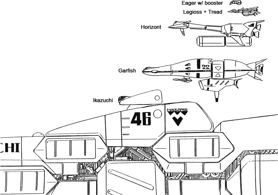 The Garfish is a high speed transporter used in more than one of the invasion fleets that attempted to recapture Earth from the Inbit. Garfish is a class of ships, not the name of an individual ship. The lowest part of the ship is a three door launching bay that carries nine Legioss in armo-fighter mode. The Garfish has a large, three-barrel beam cannon turret and six missile launching tubes. The Garfishes that took part in the Third Invasion Fleet were painted red and dark gray.