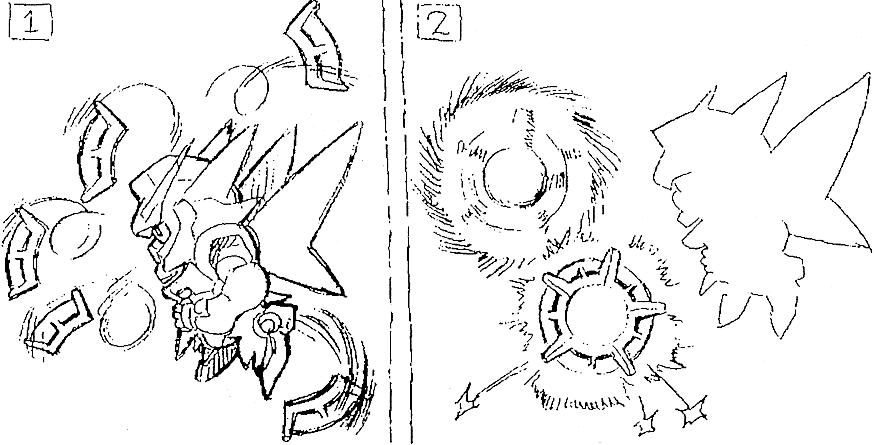 The most powerful weapon the Huckebein is equipped with is the Black Hole Cannon, which uses the full power of the Huckebein’s generator to create a localized quantum singularity that can be offensively fired at an enemy, causing intense gravity based damage. As an additional weapon the Huckebein was equipped with the Rip Slasher, an improved version of the Wildschwien’s Circle Zanber that could be remotely guided towards an enemy. Topping off its armaments the Huckebein also featured head mounted heavy vulcan style machinegun cannons, as well as the close combat Rouche Saber, an improved version of the plasma cutter featured in the Gespenst series. The Huckebein could additionally use any general weapon designed for Personal Troopers.